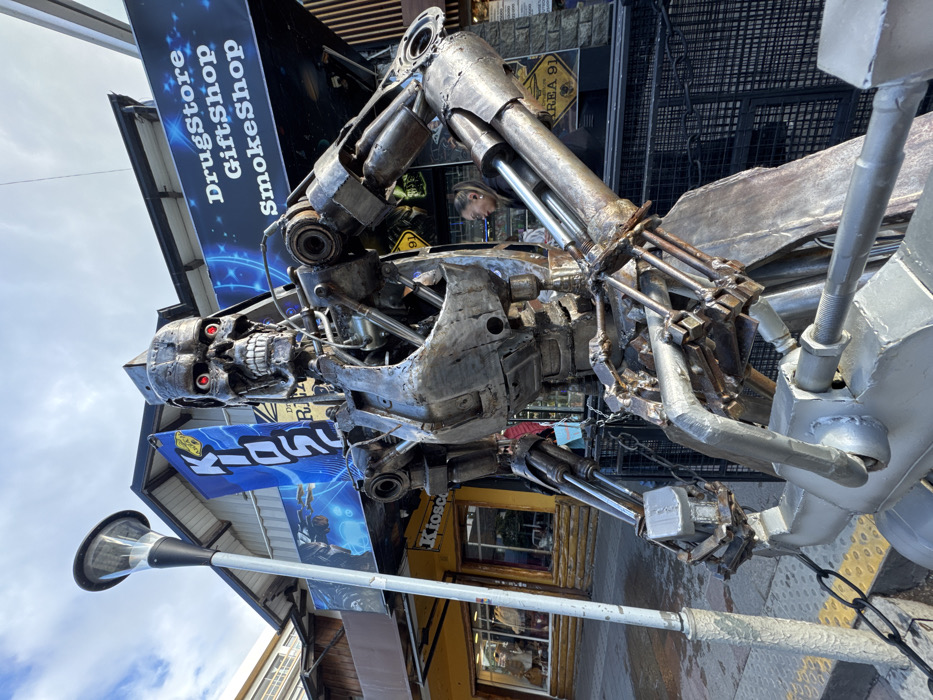 An intricate, metallic Terminator-like sculpture dominates the frame. Its skull-shaped head, with glowing red eyes, is strikingly detailed. The robot's body is constructed from various metal parts. A blue sign with "Kiosco" is partially visible behind the sculpture. A street lamp stands in the lower-left corner. Signs above advertise "Drugstore," "Giftshop," and "SmokeShop". A person can be seen reflected in the metal of the robot in the background.
