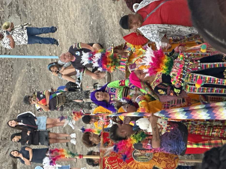 A lively group of people fills the scene, many adorned in vibrant, colorful traditional Andean clothing