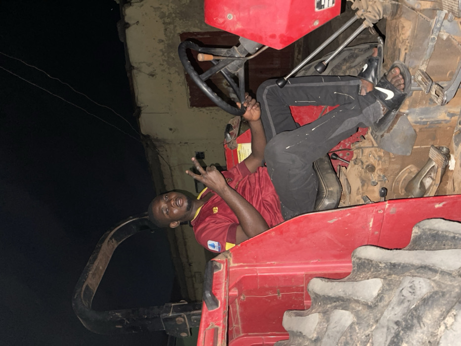 A man sits on a red tractor, facing the camera and giving a peace sign. He wears a burgundy soccer jersey and dark pants with white paint splatters, along with black Nike sandals. His legs are stretched across the dashboard, seemingly relaxed. The tractor's black steering wheel is visible, as well as other levers and pedals. A building is partially visible in the background, while the left side of the frame is dominated by darkness. One of the tractor's large tires is also in view.