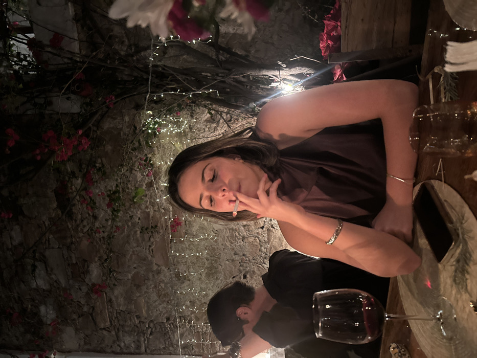 A woman in a dark brown dress sits at a table smoking a cigarette. She has short brown hair and is wearing a bracelet on her left wrist. A person in black is partially visible beside her. A glass of red wine and other glasses are on the table. The background shows a stone wall decorated with lights and flowers.