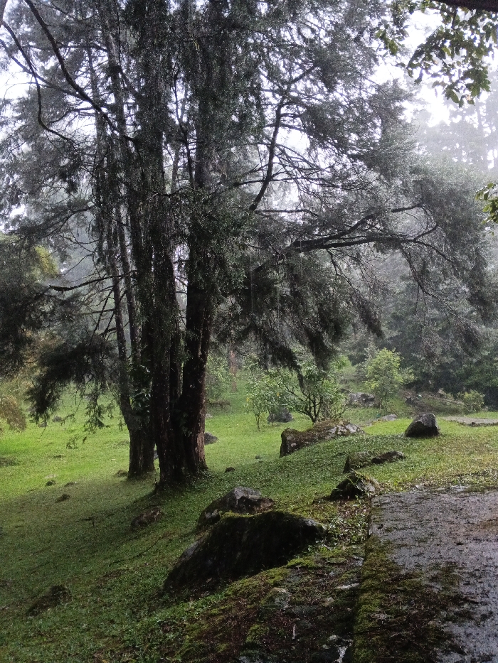 A landscape view features a grassy park on a rainy day. Tall, slender trees with sparse foliage dominate the left side of the frame. They have dark trunks. Rocks and boulders covered in moss are scattered across the lawn. A stone walkway borders the bottom right corner. The background is filled with more trees and a hazy, misty atmosphere. The overall mood is serene and damp.