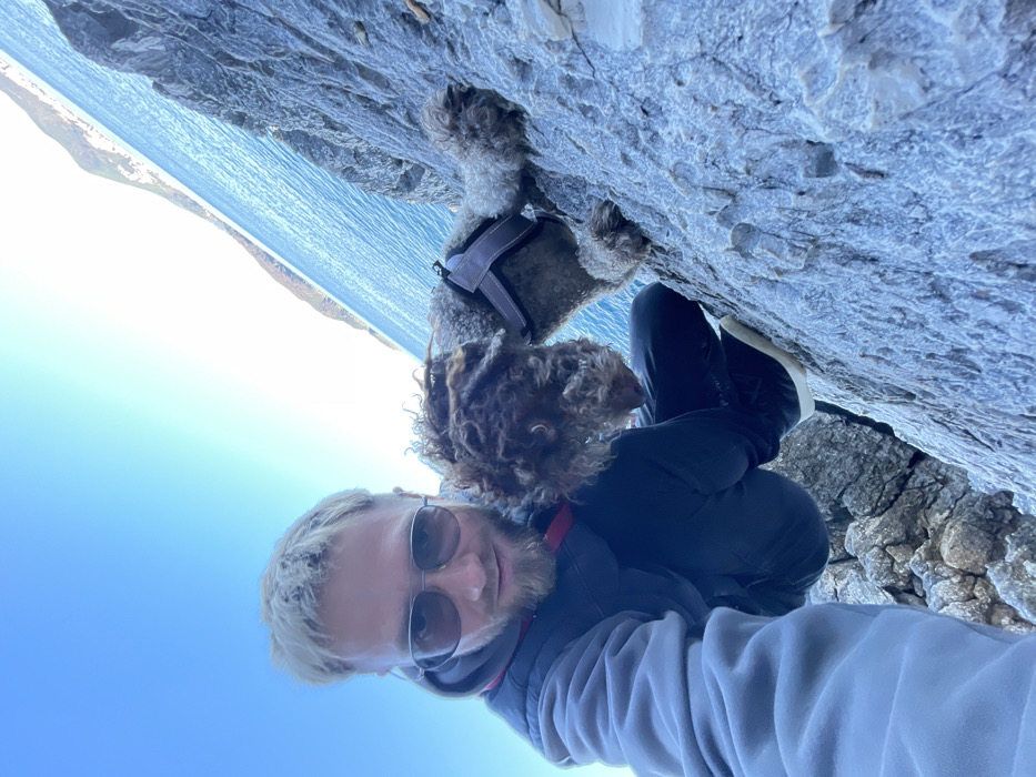 A light-skinned adult male with short, light-colored hair and a beard, wearing dark sunglasses, a grey hooded sweatshirt, and a dark sleeveless vest, is depicted in a selfie-style photograph. He is positioned on a rugged, grey rock formation. To his right, partially obscured, is a medium-sized dog with light brown, curly fur, wearing a dark chest harness. The dog's head is angled downwards, and its front paws are on the rock. Both subjects are situated on a steep, rocky incline overlooking a body of calm, blue-green water, identified as the sea, with a distant, mountainous coastline visible under a clear blue sky. The scene is located in the coastal area of Pržno, Montenegro.