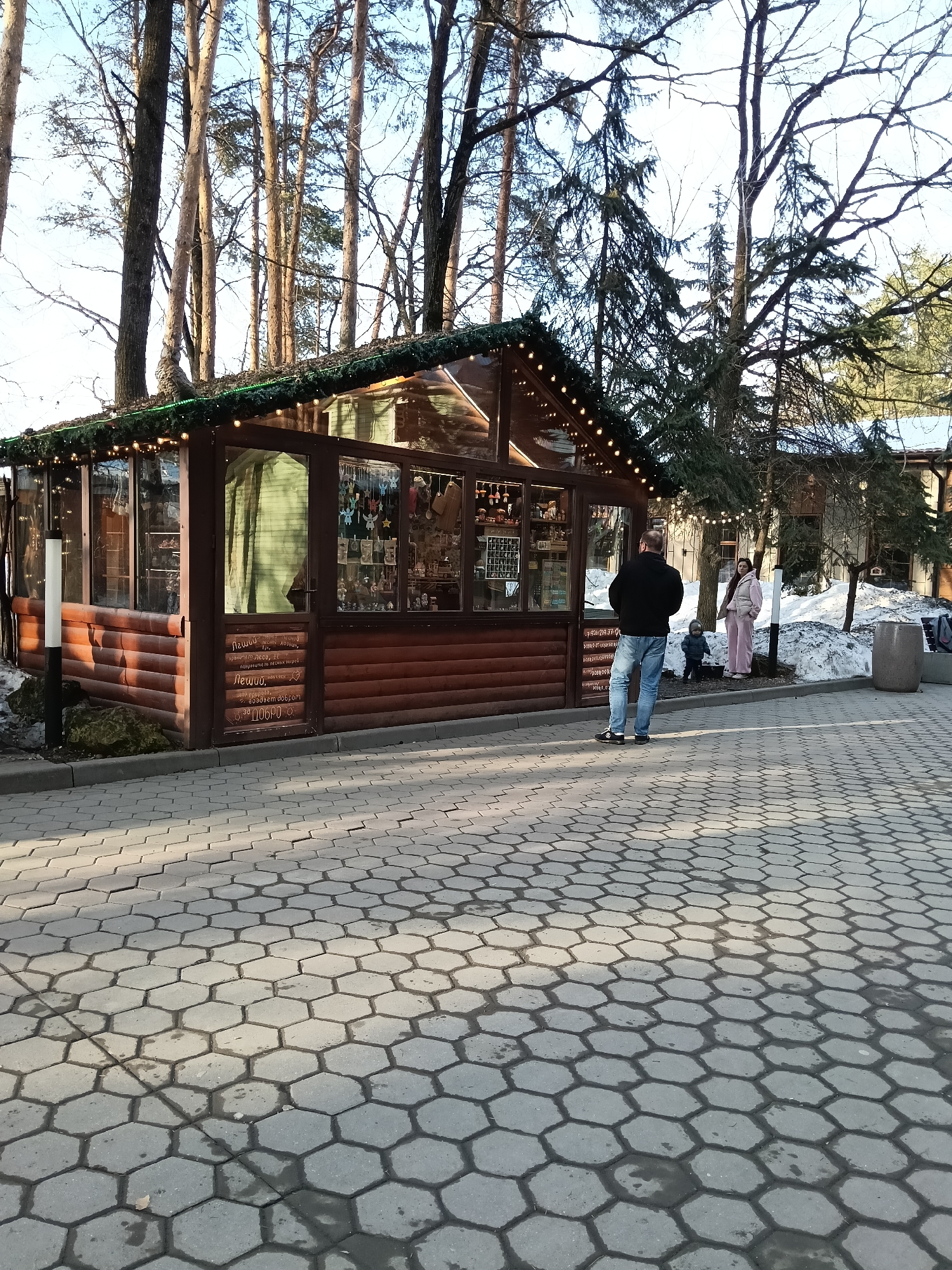 The image displays an outdoor scene within the city of Domodedovo, Russia. The foreground features a paved surface composed of hexagonal grey interlocking pavers, showing some wet or darkened patches. To the left, a single-story commercial building or kiosk is prominent. It features a dark brown wooden facade with horizontal log-style siding on its lower half and large glass windows on the upper sections. The pitched roof is adorned with a green garland and a string of warm-toned spherical lights. The windows display various items, resembling souvenirs, crafts, and packaged goods. A brown-framed glass door contains decorative text in Cyrillic script, appearing to reference traditional Russian folklore and products like honey. A black and white vertical bollard or light fixture stands to the left of the building. In the midground, three individuals are present. An adult male stands with his back to the viewer, wearing a black jacket and blue jeans, facing the building. To his right and slightly behind him, an adult female is positioned, clad in a light-colored two-piece tracksuit, looking towards the left. Between the male and female, a small child in dark clothing stands facing the female. The background is characterized by numerous tall, slender deciduous trees with bare branches and several evergreen conifers. Patches of melting snow are visible along the edge of the paved area, particularly to the right of the building and near the trees. A larger building is partially obscured by trees further in the background. The scene is illuminated by natural daylight, casting shadows across the paved surface.