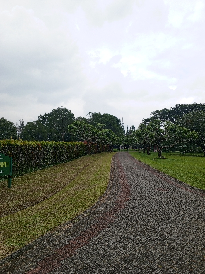 A paved pathway extends into the distance, bordered by manicured green grass and a tall, thick hedge on the left