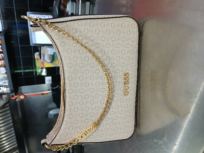 - "beige Guess purse with a repeating pattern of the letter "G" within a circle" by FM-XbczA3, licensed under CC BY 4.0