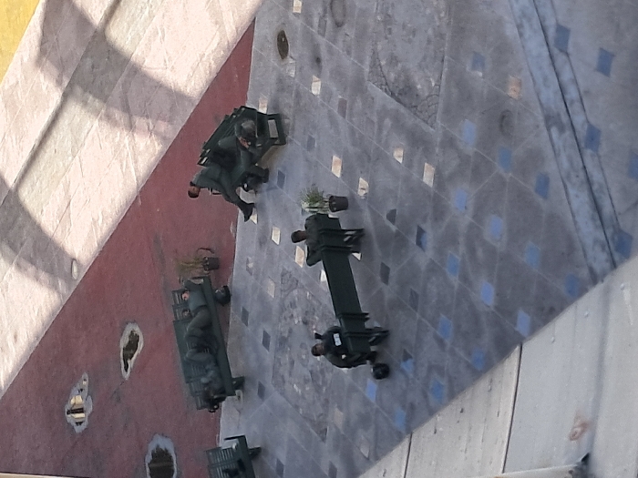 An elevated, overhead view captures an outdoor public space, identified as part of the Plaza de los Museos / Parque Central area in Caracas, Venezuela, under strong sunlight. The ground is paved with a distinctive pattern: a large red section with several circular depressions, some containing small puddles, abuts a grey tiled section featuring a grid of alternating light blue and light grey square inserts. Diagonal shadows from an unseen structure cross the scene. Six individuals, all uniformed in olive green or similar dark utility attire, are visible. In the upper-left, two individuals lie prone on a dark green slatted metal bench, appearing to be resting or asleep. A dark helmet rests on the ground beside their bench. In the upper-right, two more individuals occupy another identical dark green bench. One sits upright, facing left, while the other is slumped or lying partially on the bench, also appearing to rest. In the lower-center, a fifth individual sits on a single dark green bench, facing right. A dark helmet is positioned on the ground directly in front of this individual. A sixth person stands immediately behind the same bench, partially obscured by its backrest, also facing right. Two small potted plants are placed near the benches, one in the upper-left and another in the lower-center.