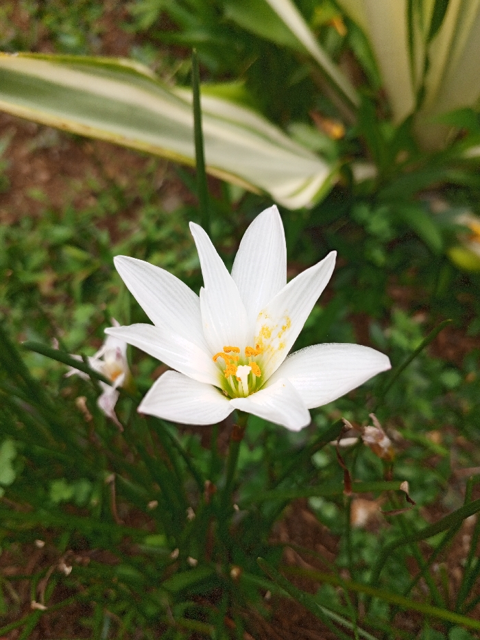 A single white flower, resembling a rain lily, is depicted in sharp focus, centered in a close-up, vertical composition. The flower displays six prominent, ovate white petals, which exhibit subtle longitudinal striations and retain minute water droplets on their surfaces. Its center reveals numerous bright yellow anthers, densely covered with pollen, surrounding a pale green pistil. To the left of the main flower, a smaller, out-of-focus flower with faded white or light pink petals is partially visible. The immediate foreground and mid-ground consist of dense, slender, dark green foliage. The background features blurred, broader leaves with variegated green and pale yellow/white stripes. The visible ground cover is dark, indicative of soil or decaying organic matter. The scene is located outdoors in Weintiapa, Liberia.