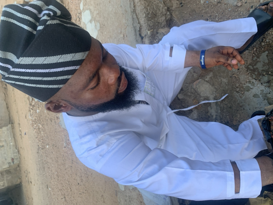 A male individual is depicted outdoors in Okene, Nigeria, in a high-angle view, crouched or seated on uneven, dusty ground