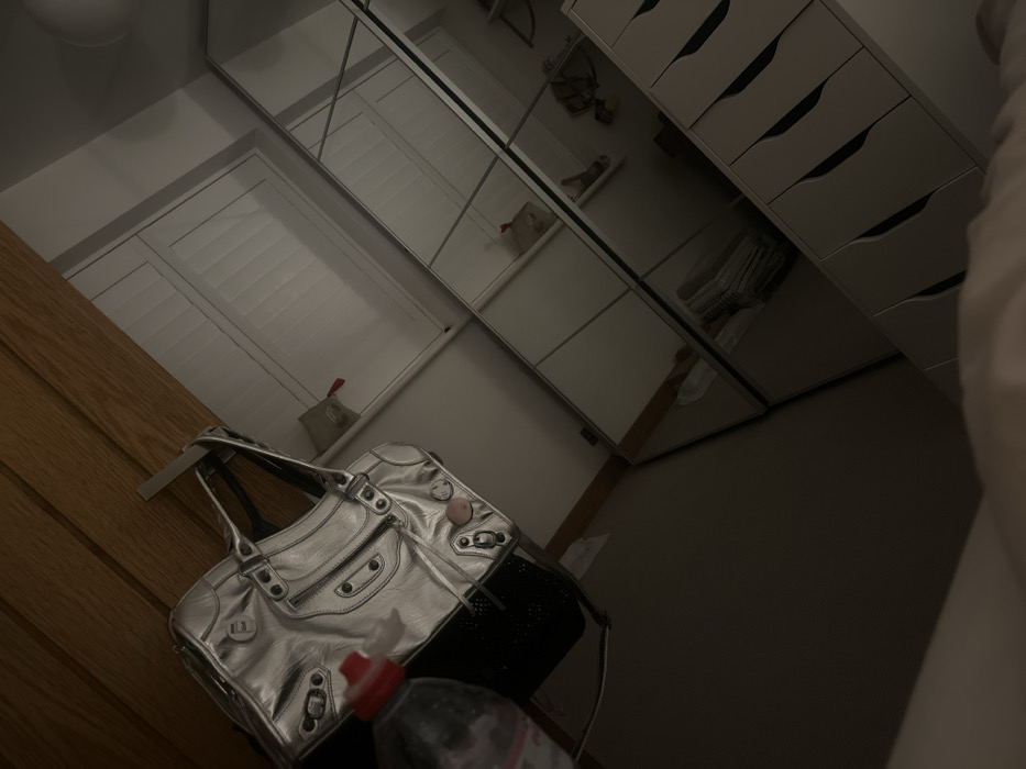 The image depicts an indoor domestic scene, likely a bedroom, viewed from a low perspective. The specific location within the city of Wealden, United Kingdom, is not discernible from the visual evidence. In the upper left, a silver-toned handbag, featuring metallic hardware including buckles, studs, and a zippered front pocket, hangs from an unseen fixture or rests against a light brown wooden surface, possibly a door or wall panel. Below and to the left of the handbag, a translucent plastic bottle with a red screw-top cap is partially visible. The right side of the image features a large furniture unit comprised of multiple mirrored panels, likely a wardrobe. These reflective surfaces show indistinct reflections of the room, including a window fitted with white louvered shutters or blinds in the upper portion. To the lower right of the mirrored unit, a white multi-drawer storage unit, featuring several drawers with dark, recessed handles, is visible. The floor is covered with a dark, neutral-toned carpet. A light brown wooden skirting board runs along the base of the wall where the mirrored unit stands. The walls are light-colored. The scene is dimly lit, suggesting low artificial illumination or limited natural light. No individuals are present.