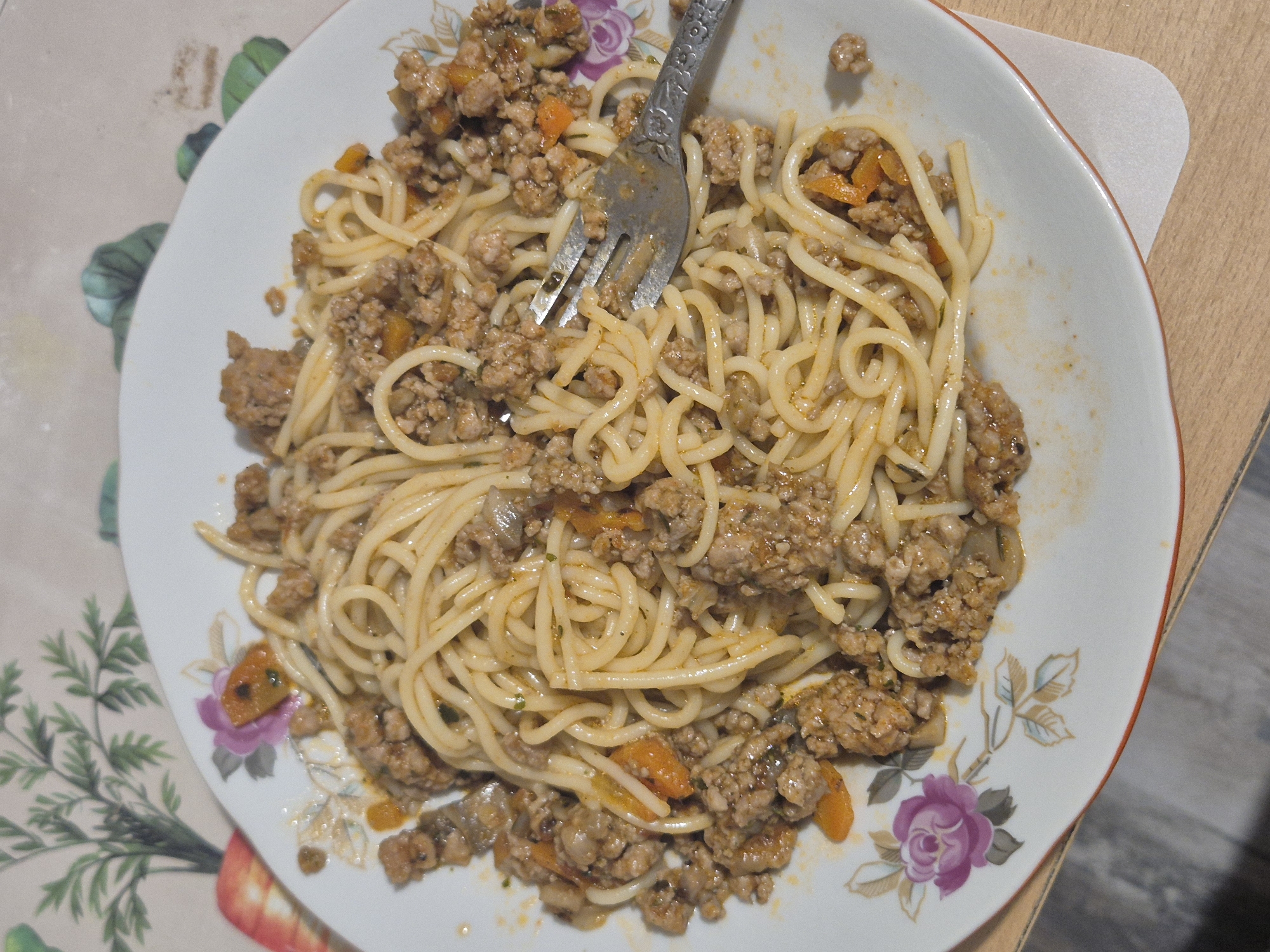 - "A close-up shot shows a plate of spaghetti with meat sauce, likely bolognese, placed on a floral-patterned tablecloth" by FM-WH1aF2, licensed under CC BY 4.0