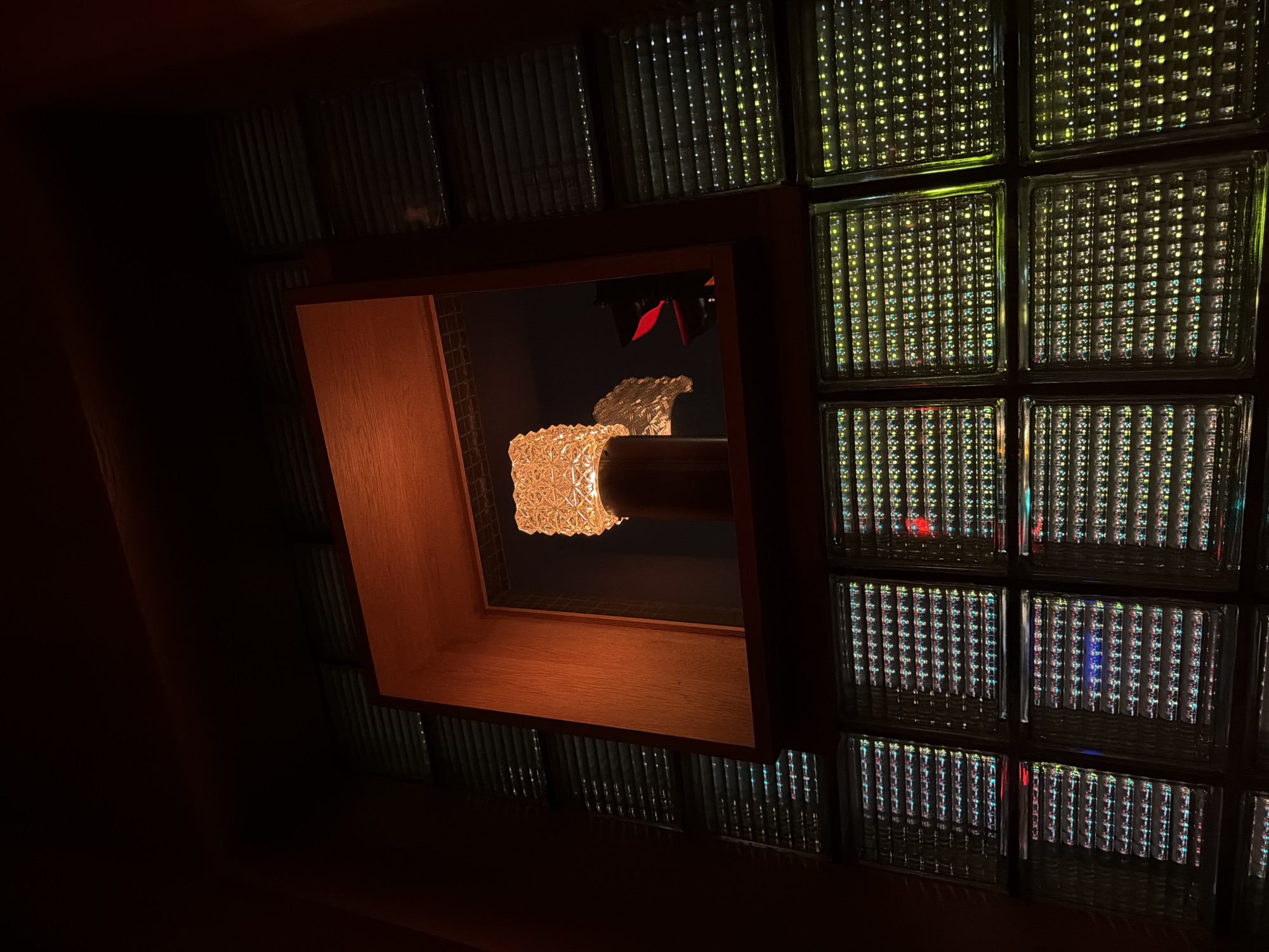 The image displays a dimly lit interior scene, identified by its distinct architectural and lighting features as the Jardin Nelson restaurant in Old Montreal, Canada. Centrally positioned is a prominent light fixture, emitting a warm, amber-toned glow, enclosed within a square, dark wooden niche. The lamp features a textured, possibly patterned glass or crystal shade mounted on a dark cylindrical column. Behind the main lamp, a reflective surface within the niche reveals a partial view of a secondary light source and a dark, angular object marked with a red accent. Below and to the sides of the wooden niche, a wall is constructed from numerous clear glass blocks arranged in a grid pattern. Each glass block contains an internal array of small, multi-colored LED lights, arranged in distinct horizontal rows, which illuminate in patterns of green, yellow, blue, and red, creating a pixelated visual effect within each block. The surrounding walls are predominantly dark, contrasting with the illuminated elements.