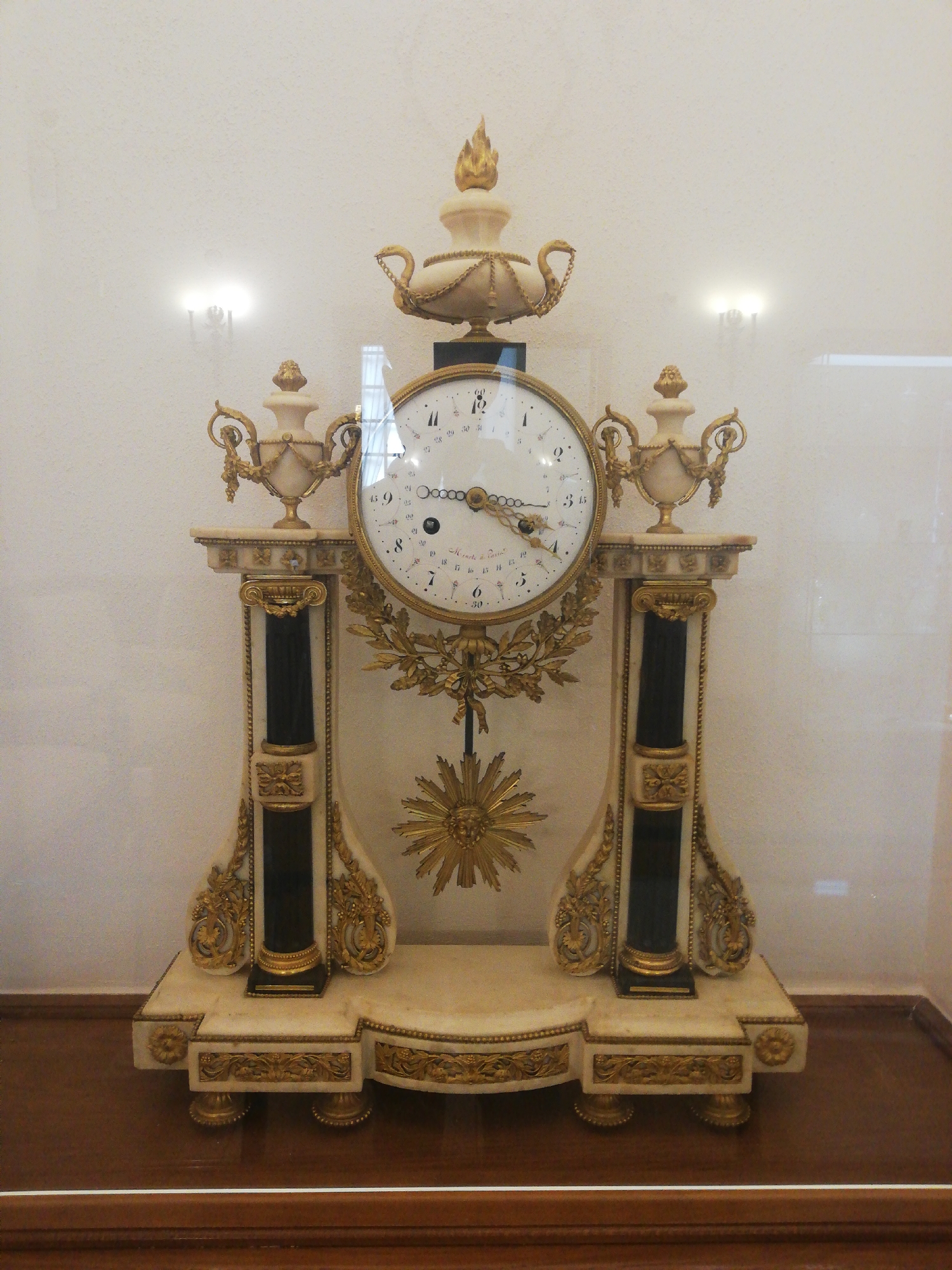 A large, ornate Neoclassical or Empire style mantel clock is displayed within a protective case in Nyasvizh, Belarus. The clock is primarily constructed from light-colored marble or alabaster, featuring extensive gilt bronze ornamentation and polished black columns. It rests on a wide, stepped rectangular base adorned with gilt decorative panels and four low, ornate feet. Two substantial uprights, each incorporating a black fluted column within a lighter frame, support individual platforms. A prominent round white enamel clock face is centrally mounted, displaying Roman numerals for hours (I-XII), and concentric rings of Arabic numerals for minutes and seconds. Ornate gilt hands indicate approximately 10:15. Below the clock face, a gilt laurel wreath motif encircles a radiating sunburst design featuring a central humanistic face. The clock is surmounted by a large, urn-shaped finial crowned with a flame motif, flanked by two smaller urns on the side platforms, all detailed in gilt bronze. The background is a plain, light-colored textured wall, reflecting two illuminated wall sconces. The clock rests on a dark, polished wooden surface, viewed through a clear glass barrier which exhibits reflections, including a distinct rectangular light source in the upper right quadrant. No people or active interactions are present.