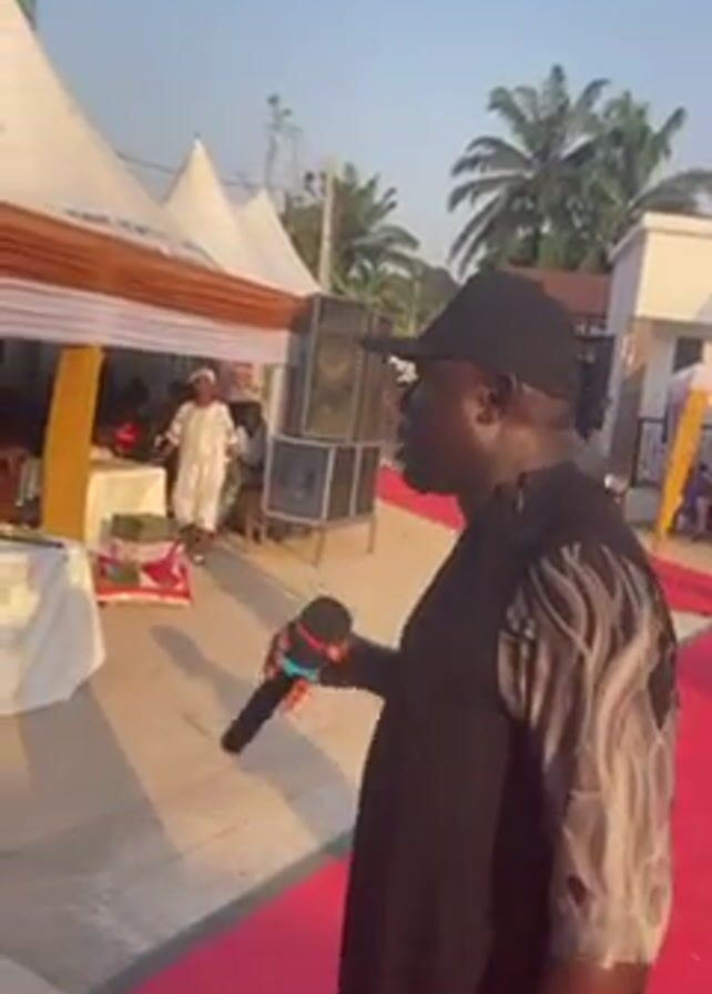A man in a black shirt and cap sings into a microphone on a red carpet outdoors. Several white tents are visible to his left. Behind the man, a speaker system stands on the ground, and other people are scattered in the background. A palm tree rises behind a white building, and the sky is clear. The man gesticulates with his arm while singing.