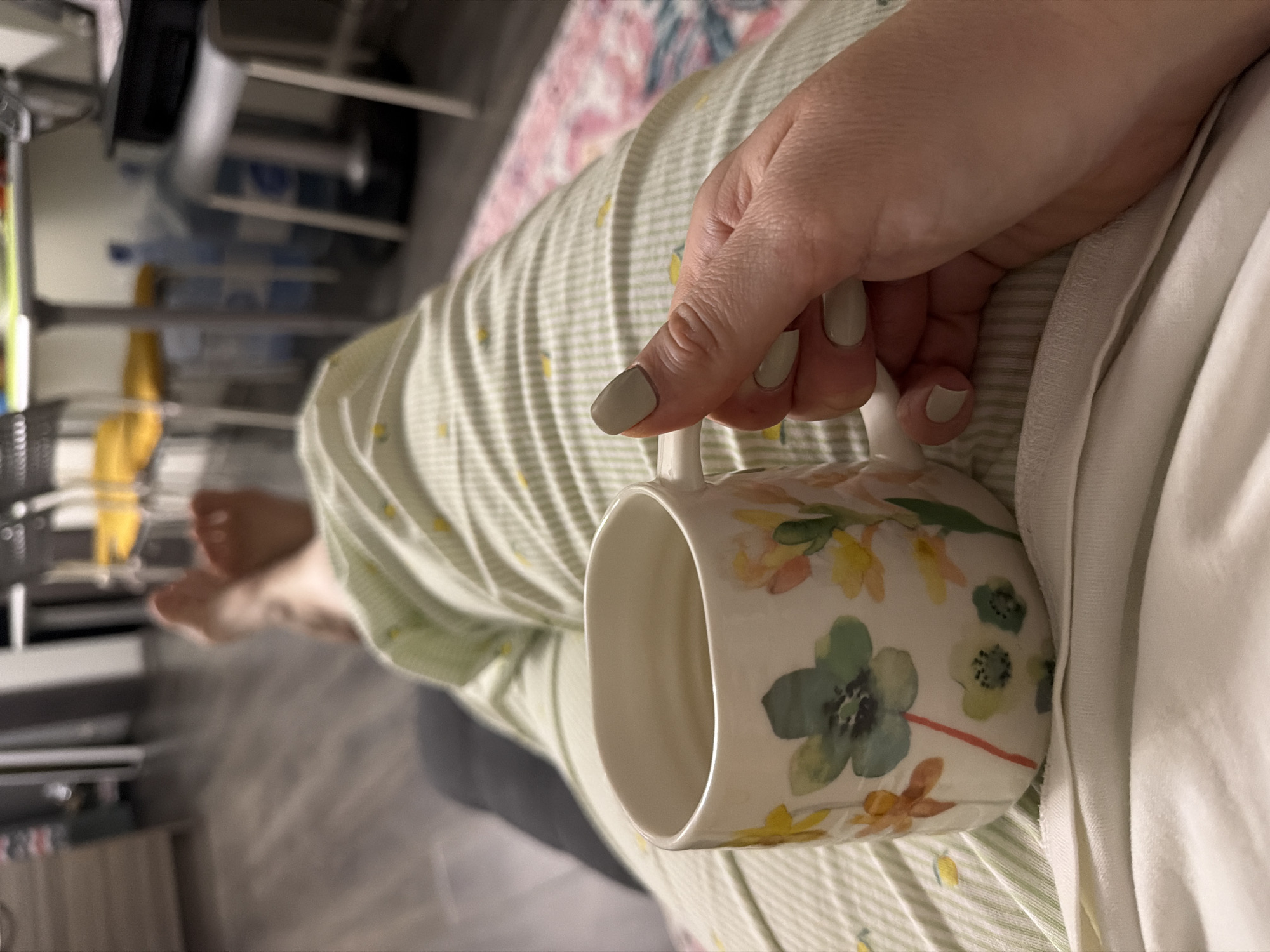 A person is seated, wearing light green and white striped pajamas, holding a white floral mug