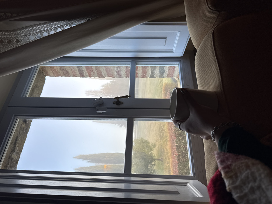 A window frame divides a view of fog-covered trees and a colorful field. The top window section shows the edge of a brick building. A tan mug is held by a hand with a silver bracelet. The foreground includes a blanket with red and pink sections and a tan couch, along with a white curtain draped above the window. The window is open, with hardware visible.