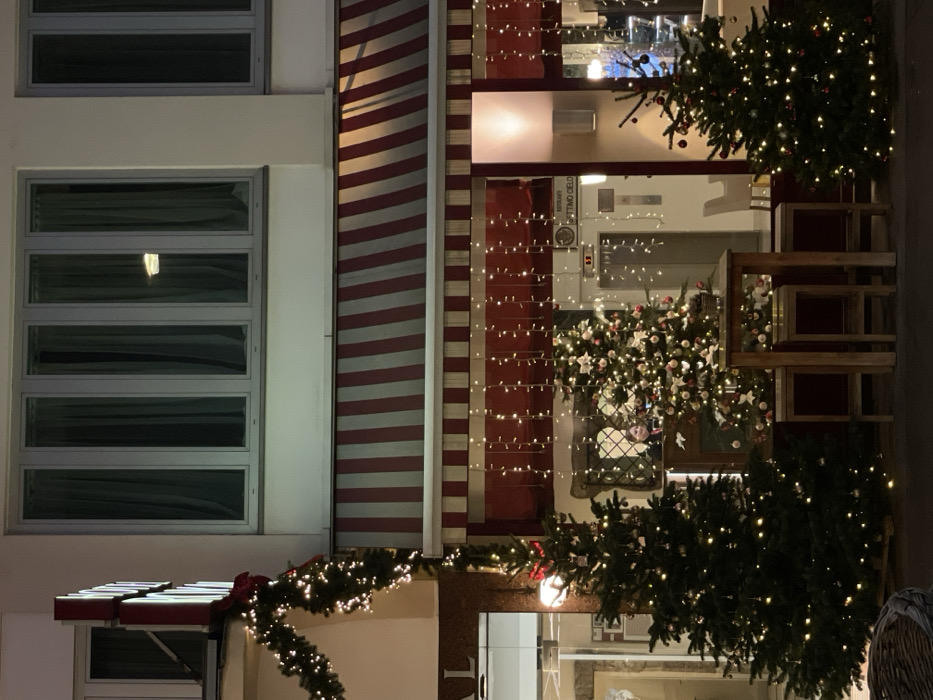 An exterior shot of a building decorated for Christmas. The building has large windows and a red and white striped awning. Christmas lights are strung along the awning and around the doorway. Potted Christmas trees, adorned with lights and ornaments, flank the entrance. Tables and chairs are visible inside the building, which appears to be a restaurant or cafe.