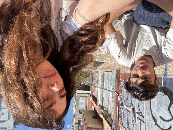 Two young adults, a female and a male, are seated outdoors in bright sunlight
