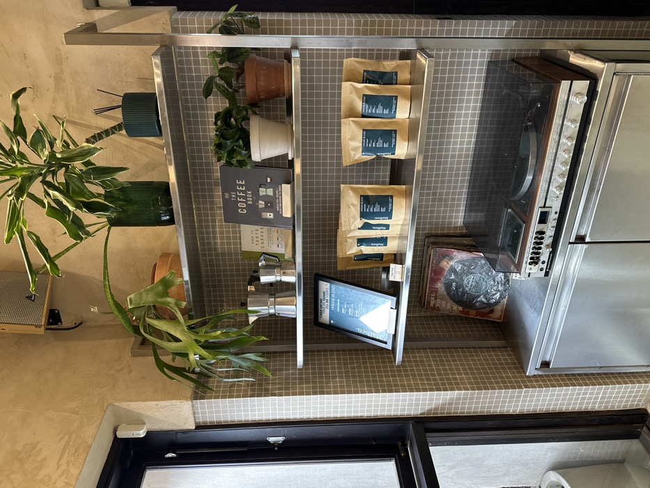 An interior shot depicts a retail display or cafe section located in Givatayim, Israel. A four-tier shelving unit constructed of polished metal stands against a wall covered in small, light beige square tiles. The upper wall transitions to a textured, light-colored plaster finish. On the topmost shelf, several potted plants are arranged, including a large leafy plant in a dark green ribbed pot, a smaller plant resembling a Staghorn fern in a terra cotta pot, and another dark green ribbed pot containing diffuser sticks. The second shelf displays two silver Moka pots of different sizes, three books (identifiable titles include "How to Taste Coffee" and "The Coffee Book"), and two small potted plants in ceramic containers. The third shelf features a black-framed sign titled "HOUSE BLEND," accompanied by a small dark cylindrical item and eight light brown kraft paper bags labeled "HOUSE BLEND Malben." The bottom shelf functions as a stainless steel countertop for a two-door metal cabinet. Upon this surface rests a stack of vintage vinyl records, some in clear plastic sleeves and bearing the Columbia Records label, alongside a vintage-style turntable and receiver combination unit with a clear plastic dust cover, a silver faceplate, and wooden side panels. A dark-framed window is visible on the far left, and a small white rectangular sensor is mounted on the adjacent tiled wall. High on the upper left wall, a metallic speaker or vent grille is affixed. The scene contains no human subjects or active interactions.