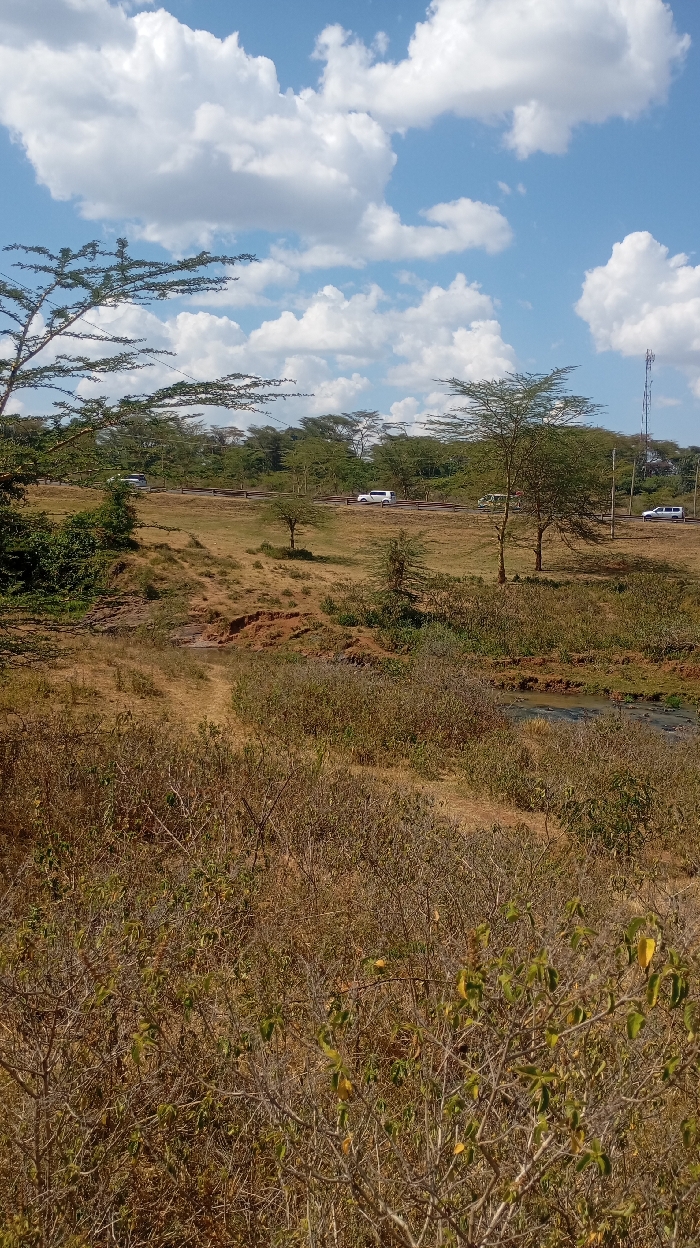 A landscape shot depicts a dry, grassy foreground dotted with shrubs, transitioning to a shallow ravine with water. Beyond the ravine, a grassy bank leads to a road with several white vehicles in motion. A line of trees runs along the roadside. Overhead, a bright blue sky is filled with fluffy white clouds. A communication tower stands at the edge of the trees on the right.