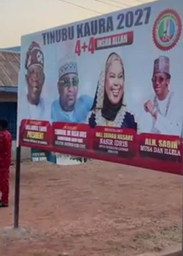 political billboard on the side of a street. The billboard reads “Tinubu Kaura 2027” and “4+4 Insha Allah” with portraits of four people and their titles. From left to right, they are “Asiwaju Ahmed Tinubu, President, Federal Republic of Nigeria," "Comrade Dr. Nasir Idris, Governor, Kebbi State," "Haj. Zainab Nasare Nasir Idris, Wife of the Executive Governor, Kebbi State," and " Alh. Sabiru Musa Dan Illela." The logo of the All Progressive Congress (APC) is in the top right corner. A person in a red patterned outfit walks to the left of the billboard. A building with a blue door is visible behind the billboard on the left. The sky is visible in the background.