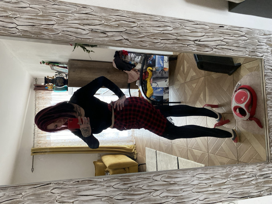 The image displays a female individual taking a mirror selfie in an indoor residential setting located in Kunje, Montenegro. The individual, positioned in the center of the frame's reflection, holds a red smartphone with her right hand, positioned at chest height. She has dark hair with red streaks and visible tattoos on her arms and left hand. Her left hand rests on her hip. She is dressed in a black long-sleeved top, a red and black plaid mini-skirt, black tights with a lace detail visible on the upper left thigh, and multi-colored high heels in white, grey, and red. The room features a light-colored tiled floor with a geometric pattern. In the background, a window or glass door is covered by sheer white and opaque yellow curtains. To the left, a segment of a yellow upholstered sofa or armchair is visible. To the right, a dark wooden cabinet holds decorative items, including a dark vase, a blue bottle, and framed objects. A potted plant with red elements is also on the cabinet. Behind the individual, a multi-colored piece of furniture or fabric item is present. A dark, possibly electronic, appliance is on the floor to the right. In the foreground, a red and white retractable dog leash rests on a light-colored stool or ottoman. The mirror itself features a thick, carved frame with a distressed, light-colored finish.