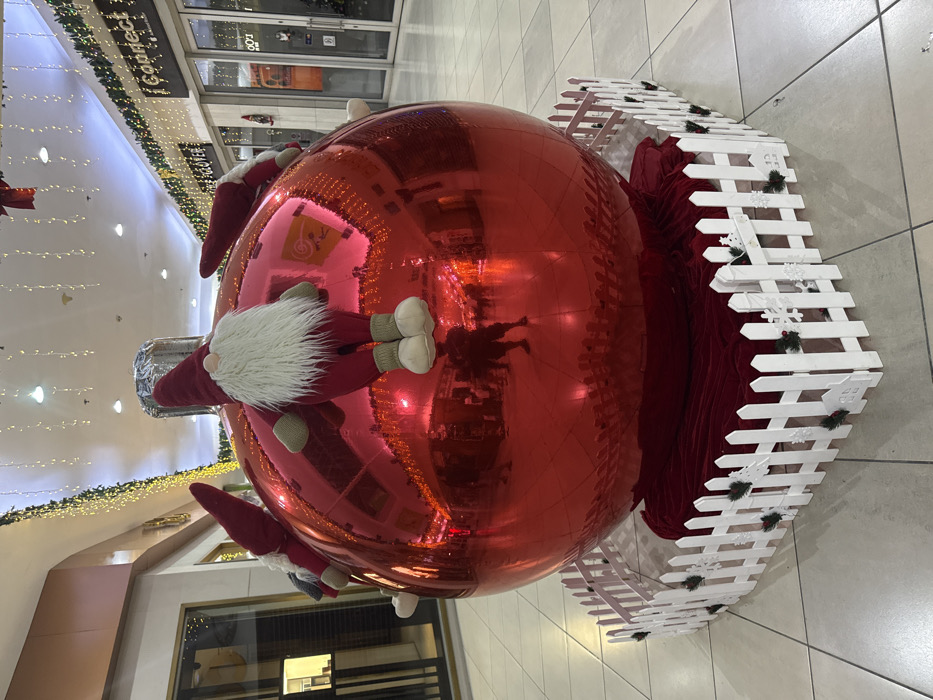 A large, shiny red Christmas ornament stands in a shopping mall. Three plush gnome figures are attached to the ornament. A white picket fence adorned with snowflake decorations and miniature trees encircles the base of the ornament, which is draped in red velvet fabric. The mall setting includes tiled flooring, store fronts, and decorative lights.