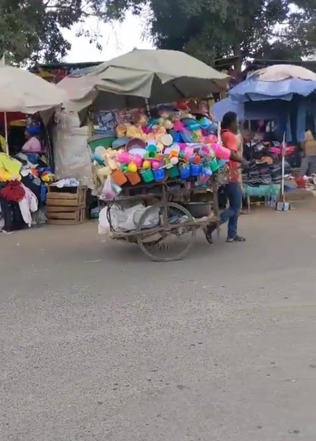 vendor pushing a rickshaw loaded with merchandise through an outdoor market