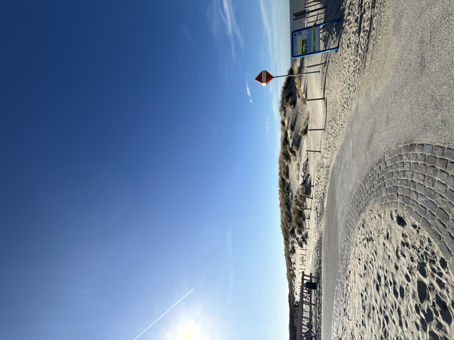 The image displays a coastal landscape in The Hague, Netherlands, under a clear, bright blue sky. A strong sun glare originates from the upper left, accompanied by a linear white airplane contrail extending diagonally downwards. The lower third of the frame consists of a sandy beach and dune system. A grey asphalt path, featuring an inlay of dark cobblestones in its foreground curve, traverses from the bottom center towards the right. To the left of this path, partially visible are a wooden picnic table with benches and a dark trash receptacle, set against sand dunes covered with sparse, dry dune grass. A series of evenly spaced wooden posts demarcate the edges of the path and the dunes. On the right side of the path, a red-orange triangular sign with a white border displays "Strandweg 9" in a black number on a white circle, mounted on a metal pole. Adjacent to this sign is a blue rectangular information board, positioned on a metal stand and oriented away from the camera. The distant horizon on the right reveals a segment of the calm, blue-grey North Sea. No identifiable individuals or specific actions are discernible within the scene.