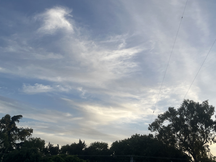 The image depicts an outdoor scene in Bernal Este, Argentina, dominated by a partially cloudy sky. The sky features cirrus and stratocumulus cloud formations, appearing white and light gray against a pale blue background, with brighter areas towards the horizon indicating diffused sunlight. In the upper right quadrant, two parallel thin black utility lines are visible, extending diagonally downwards from the top right edge towards the center. A small black object, possibly an insulator or connector, is present on the lower of these two lines. The lower portion of the image displays the dark silhouettes of treetops and dense foliage, forming a horizontal treeline that obscures the ground level. The lighting suggests either early morning or late afternoon conditions due to its diffused quality. No human figures or direct interactions are visible.