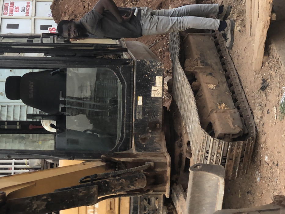 A man in a gray t-shirt and jeans stands on the left track of a yellow and black SANY excavator. The excavator cabin is visible, with a black seat and clear glass. The right track is dirty and sits on a dirt surface. A building with a sign that says "ICE BLOCK IS AVAILABLE HERE CALL 8063728010" is partially visible in the background.