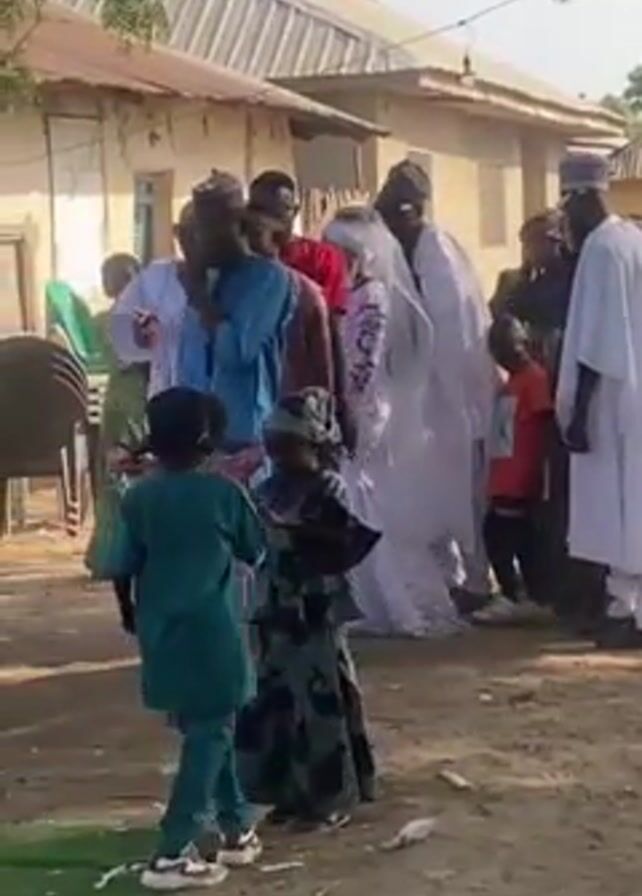 In an outdoor setting, a group of people, including adults and children, are gathered. Most adults are dressed in traditional attire. There is music playing, and some individuals are dancing. The environment is somewhat rural, with buildings visible in the background. The ground is dirt or gravel. Some children are wearing colorful clothing, and others wear more casual outfits. The general atmosphere appears festive.