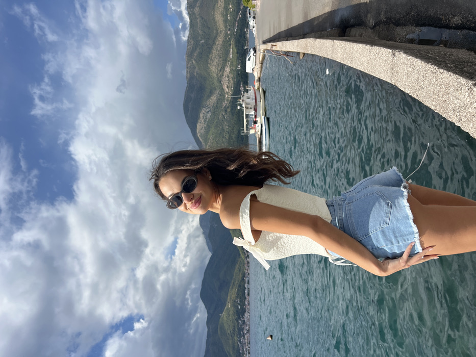 A young adult female is depicted standing on a stone quay in Donja Lastva, Montenegro, under a partially cloudy sky