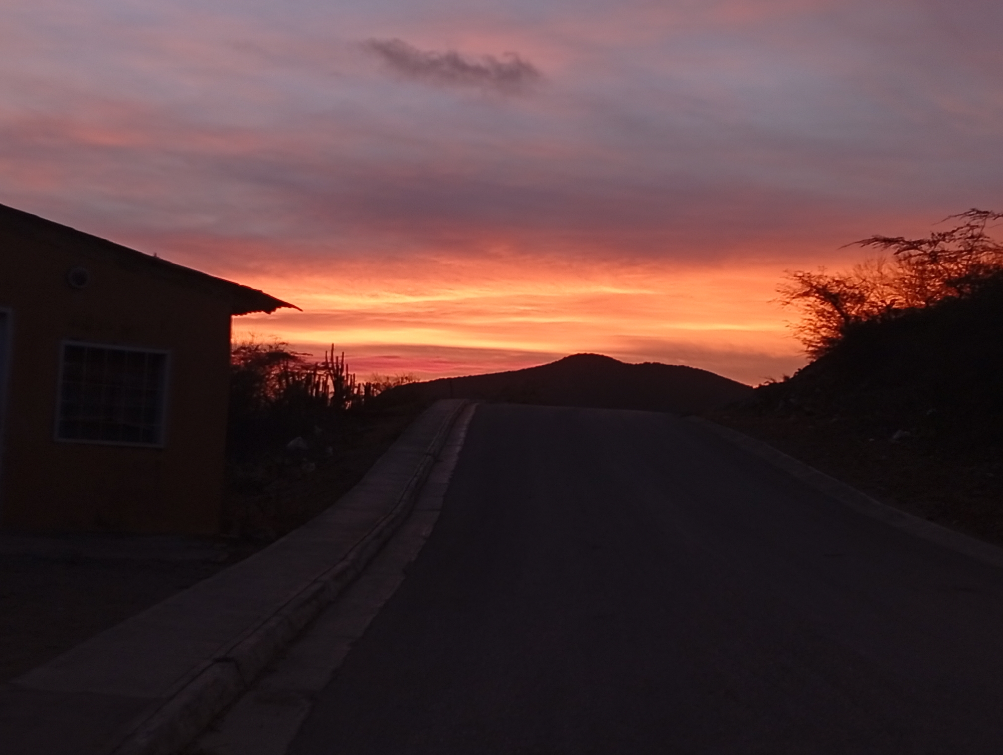A twilight scene depicts a road ascending toward a hill against a vibrant sunset sky. To the left, a building with a window and dark facade is partially visible. Vegetation, including cacti, can be seen in the background. The photograph appears to be taken in a rural or sparsely populated location, with the road serving as the primary element guiding the viewer's eye towards the horizon. While the image offers no direct indication of its location being Altagracia, Venezuela, the description provided focuses solely on the visual elements within the frame.