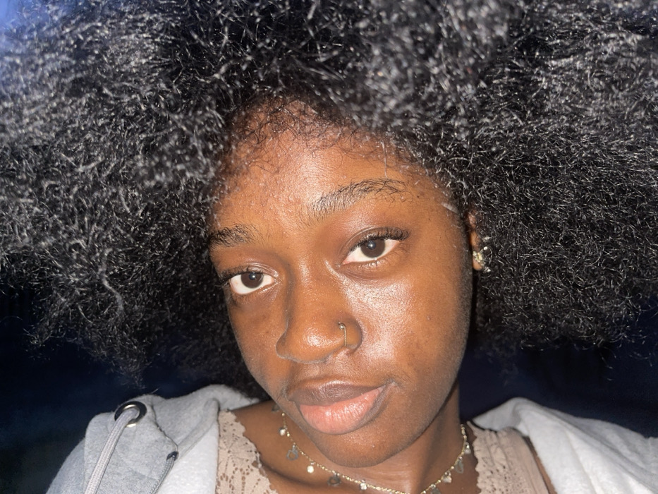 A young Black woman poses for a selfie. Her large, dark hair frames her face. She has dark eyes, full lips, and a nose piercing. She wears a delicate silver necklace with charms. She wears a gray hoodie and a lacy top. Her skin has a dewy sheen. The background appears dark, possibly suggesting an evening or dimly lit setting.