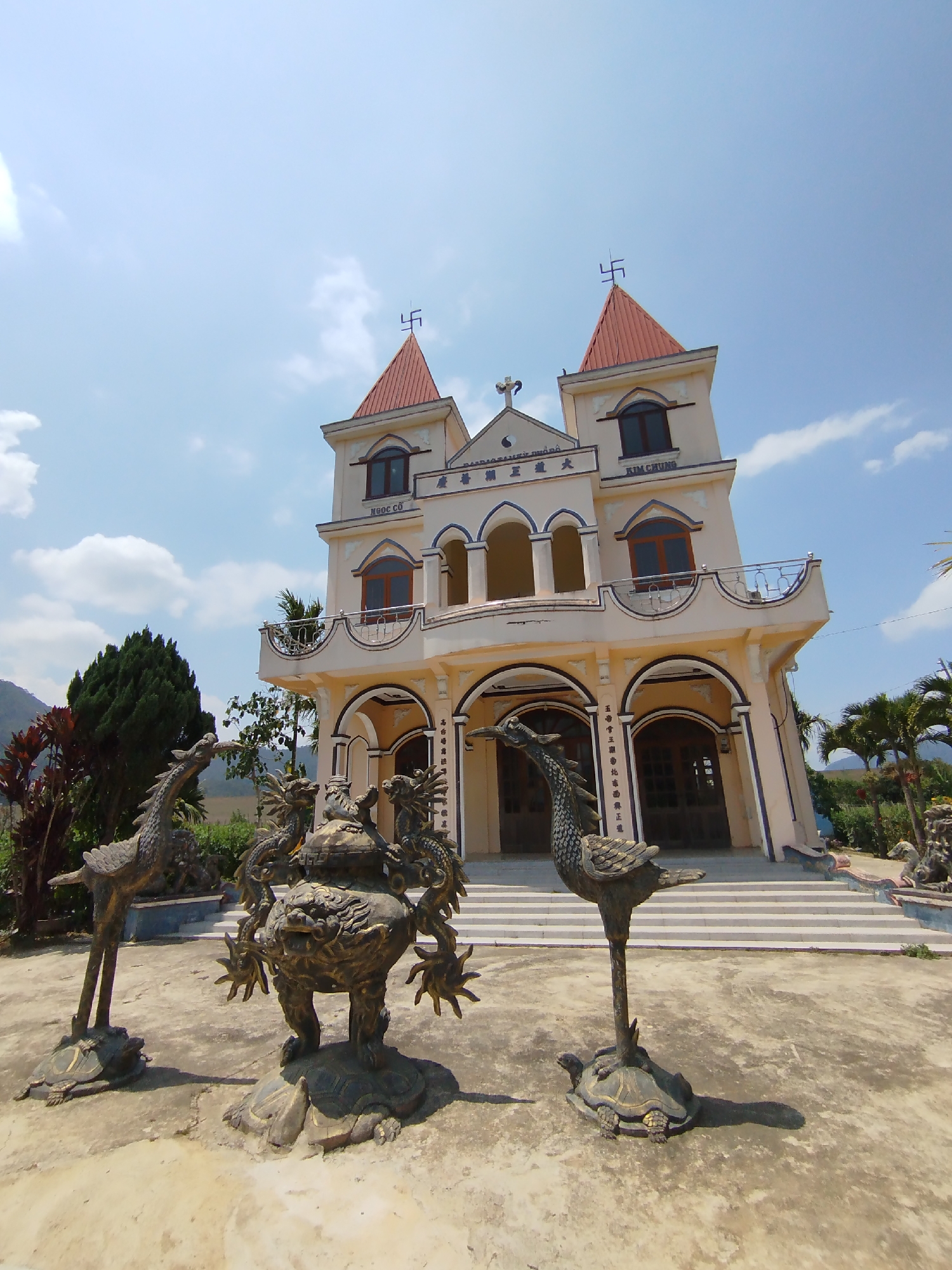 unique building in D'Ran, Vietnam, combining various architectural styles. The facade features two towers topped with red roofs and symbols resembling swastikas, a Christian cross, and arched windows. The building has "NGOC CO" and "KIM CHUNG" inscribed on it. In the foreground are three bronze statues of mythical creatures. One is a large ornate incense burner with a dragon design resting on a turtle base. The other two are bronze statues of birds, each standing on turtles. The building is set against a partially cloudy sky. The ground in front of the building appears to be a concrete courtyard. Green vegetation is visible in the background.