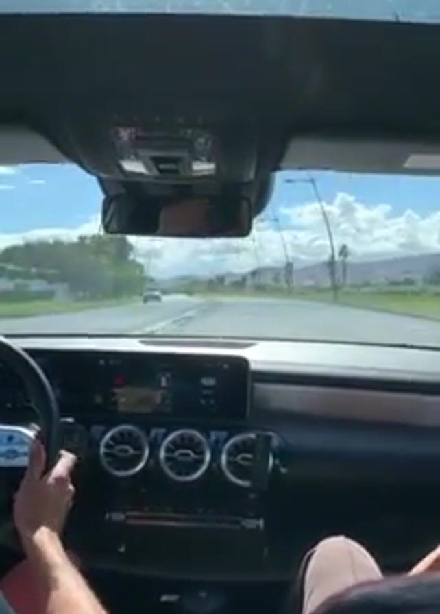 The view from inside a black Mercedes-Benz with a large sunroof shows the driver operating the vehicle on a palm tree-lined road. The dashboard displays the car's information, and the air vents are circular. There is a passenger in the front seat using a cell phone. The weather is sunny, and the road is clear. The driver is wearing a red shirt, and the passenger is wearing a brown shirt.