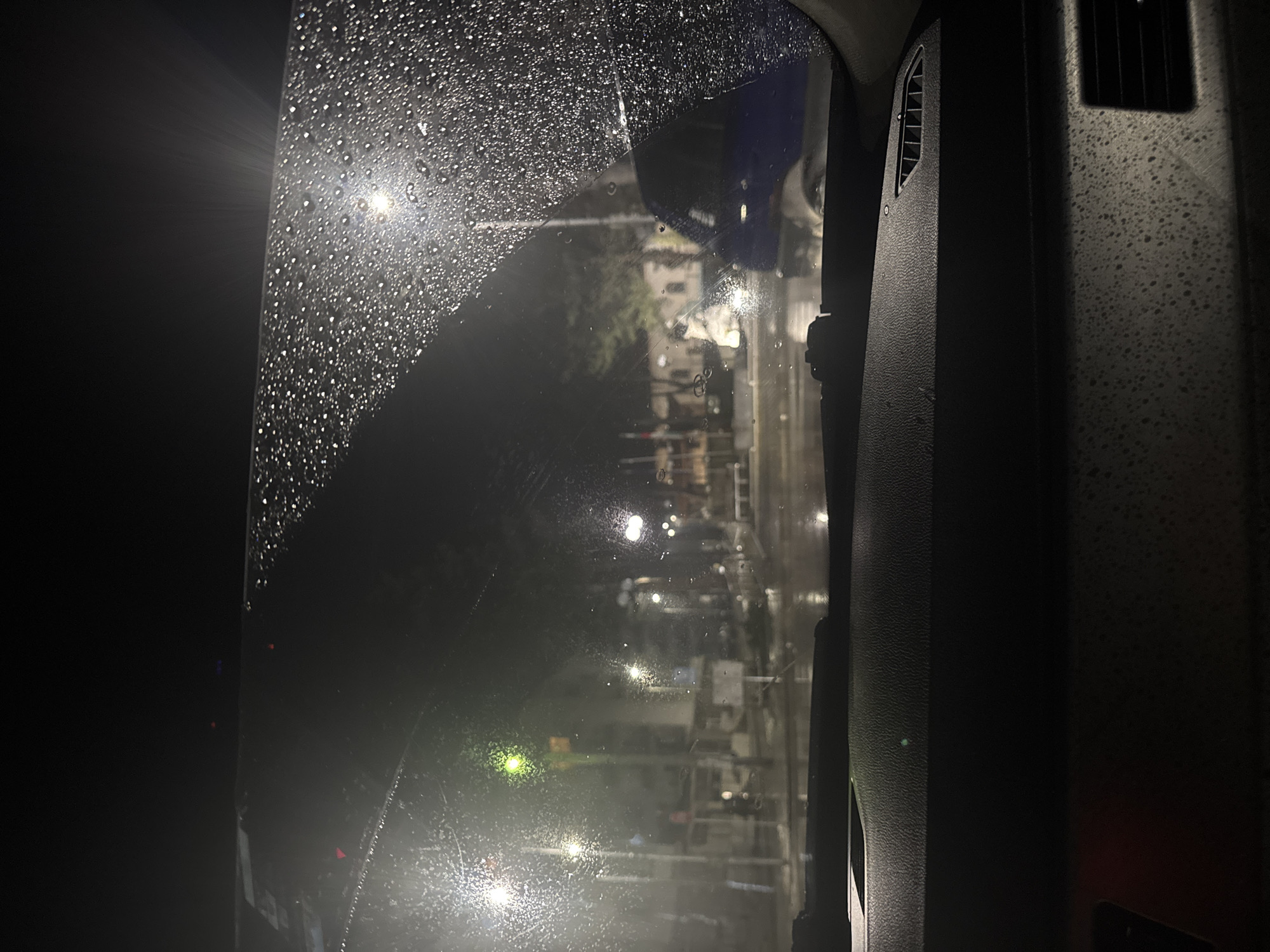 night scene in Velingrad, Bulgaria, viewed through a rain-covered car windshield