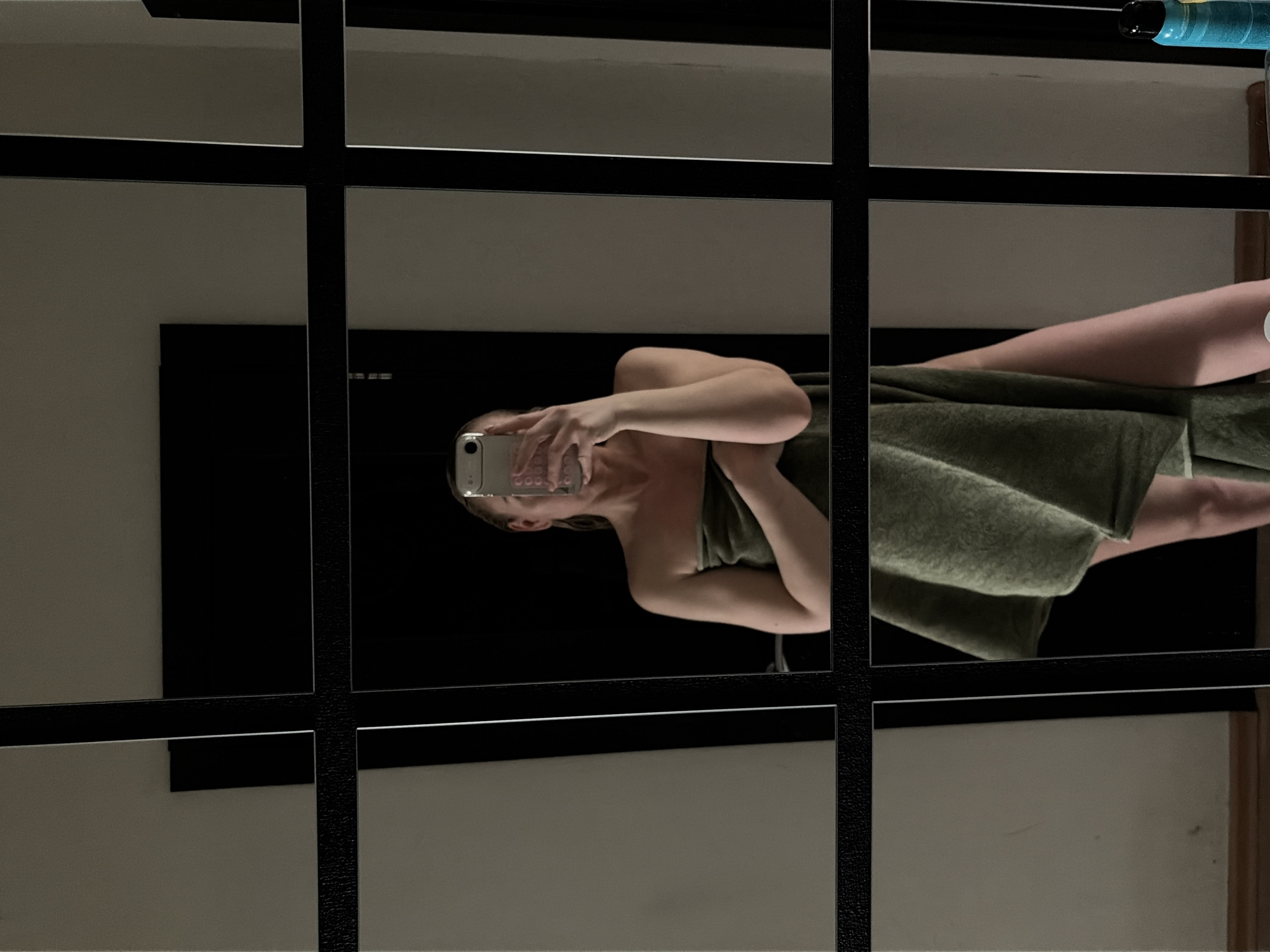 A mirror selfie shows a woman in a green towel in what appears to be a bathroom. The mirror is divided into several panels with black frames. Behind the woman is a black wall or panel. A wooden-like wall is visible on the right side of the frame. The location is not determinable from the image.