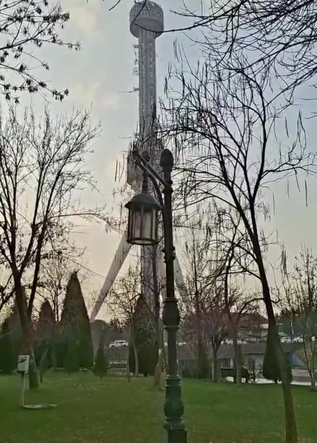 park-like area with a tall tower in the background, partly obscured by trees. A black, ornate lamp post stands in the foreground on a green lawn. Several trees are scattered throughout the park, most without leaves. Some small evergreen trees are also visible. A paved path is on the right side of the frame. The sky is overcast. The camera pans slowly to the right.