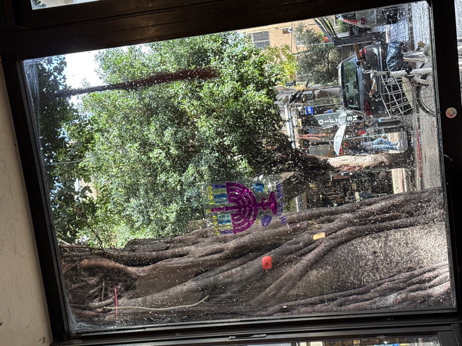 The image displays an urban street scene in Tel Aviv, Israel, observed through a window speckled with numerous small droplets or particles. A large tree with a thick, textured trunk and prominent aerial roots dominates the left foreground, partially obscuring the street beyond. Adhered to the window, visually overlapping the tree trunk, is a purple, glitter-embellished Hanukkah menorah decal featuring nine colorful candle flames and partial Hebrew text below. An orange, rectangular tag marked "14T" is visible on the tree's surface. Beyond the window, a city street is visible, lined with dense green foliage from various trees. On the right side of the frame, a dark-colored SUV is parked on the wet asphalt street, its rear facing the viewer, equipped with what appears to be a bicycle rack. A white bicycle with a front basket is positioned in the immediate foreground of the SUV. Further along the pavement, a person wearing blue jeans and a dark top is visible holding a white umbrella, partially obscured by a tree. Storefronts and building facades are discernible in the midground, including one displaying "GIFT SHOP" vertically and another with the number "180". Distant buildings and a bright sky are visible above the tree line.