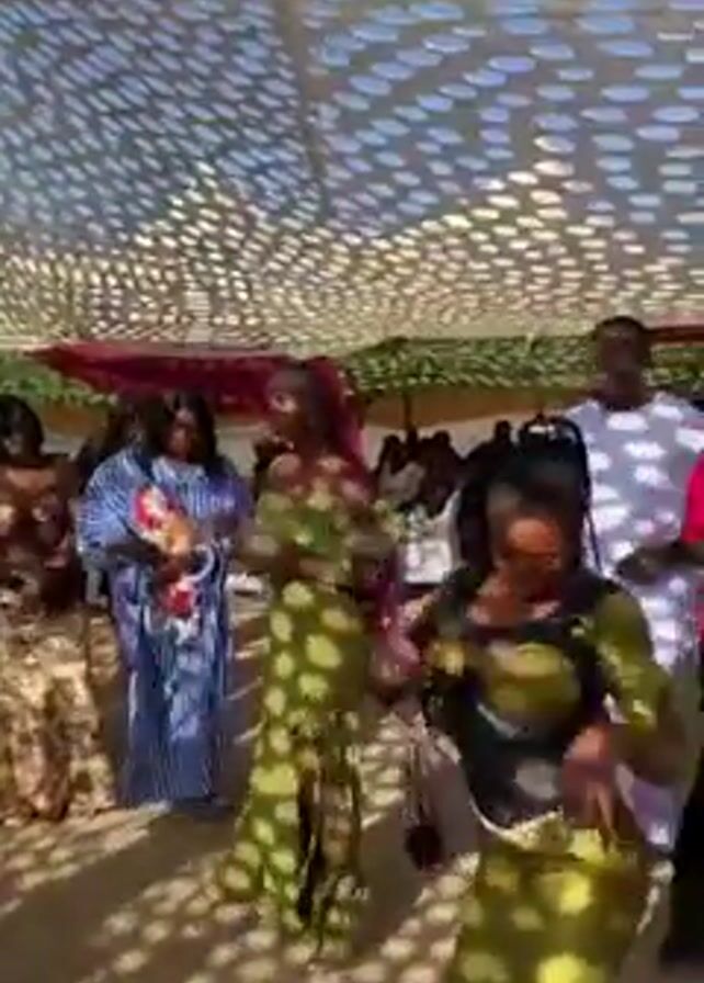 A crowd of Black people are dancing under a shade awning in an outdoor area. The awning has a grid-like pattern of holes. The ground is tan. Most of the people are women, and they are wearing colorful patterned dresses. One man in a white T-shirt and dark sunglasses is dancing with the women. There are other people seated at tables in the background. The video is taken from a low angle.