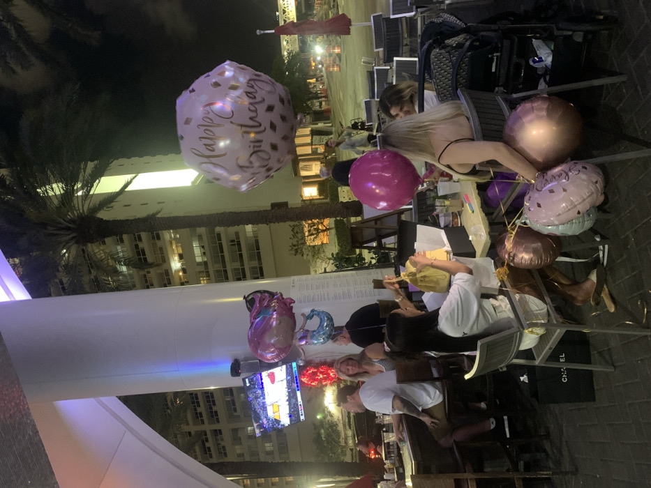 The image depicts an outdoor dining or lounge area at night, located in the Downtown Miami / Brickell vicinity of Miami, Florida, USA. A large white cylindrical pillar, partially illuminated with colored light, supports a modern overhead structure. A flat-screen television, mounted on the pillar, displays a basketball game in progress. Tall palm trees and illuminated multi-story buildings are visible in the background, consistent with an urban environment. In the immediate foreground, two females are seated at an outdoor table. One female, with long dark hair, wears a white t-shirt and is observed opening a black gift box, revealing a yellow drawstring handbag. A black Chanel shopping bag is positioned on the ground next to her chair. The second female, with blonde hair, is seated with a cluster of three balloons (one rose gold, one light blue/silver, one light pink) secured to her chair. A large fuchsia balloon is also present near this individual. Drinks are visible on the table. Several other individuals are seated at adjacent tables and a bar counter in the mid-ground. A male in a white t-shirt and shorts, and a female with blonde hair are identifiable. A baby stroller is positioned near the blonde female's chair. Additional balloons include a large, hexagonal light pink 'Happy Birthday' balloon floating in the upper right, and a pink and blue mermaid-shaped balloon situated near the white pillar. The distant background reveals a city street with traffic, streetlights, and orange construction cones.