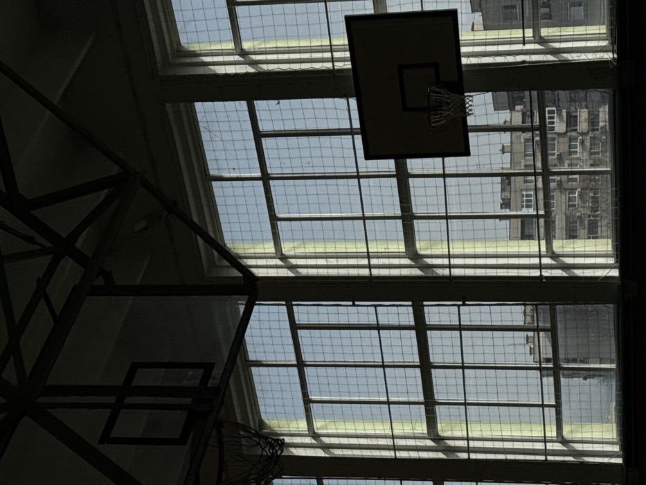 The image depicts the interior of a gymnasium in Yambol, Bulgaria, viewed from a low angle, looking outwards through a bank of tall, multi-pane windows. The interior elements are largely silhouetted against the bright exterior light. In the foreground, dark structural beams of the ceiling are visible. Two basketball backboards with rims and nets are present: one partially visible on the upper left, another more fully displayed on the right, both rendered in silhouette. The right-side backboard is rectangular with a light border and an inner square. The central and right portions of the image are dominated by multiple large, vertically oriented windows, each divided into numerous smaller panes. A fine-grid protective netting covers the entirety of these windows. Light blue sky is visible through the window panes, along with faint vertical yellowish streaks of light. Through the lower sections of the windows, an urban environment is discernible. Several multi-story buildings, appearing to be residential or commercial structures with multiple windows and balconies, are visible under the clear sky. No individuals or active subjects are present in the scene.