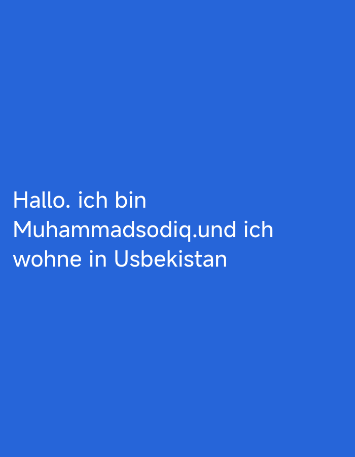 White text on a solid blue background states "Hallo. ich bin muhammadsodiq.und ich wohne in Usbekistan". This translates to "Hello. I am Muhammadsodiq. and I live in Uzbekistan". It appears to be a simple self-introduction in German.