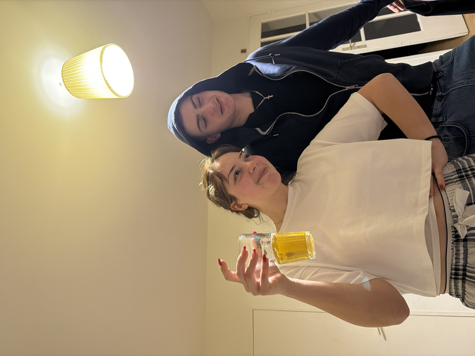 Two people are in a room. The person in the front is holding a clear glass mug with a yellow liquid. They are wearing a white shirt and plaid pants. The person behind them is wearing a blue hooded sweatshirt and jeans. There is a light fixture on the wall. There is a white door in the background. Both individuals are smiling.