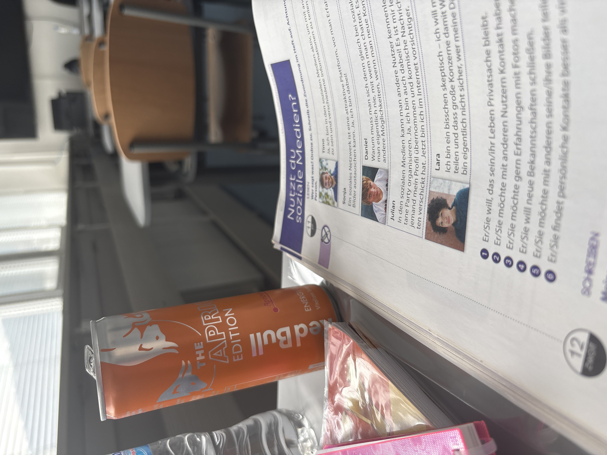 The scene depicts an indoor environment, likely a classroom or study area, located in Svishtov, Bulgaria. In the foreground, on a light-colored surface, an open orange Red Bull energy drink can, labeled "THE APRICOT EDITION" with silver text, stands upright to the right of a partially visible clear plastic water bottle. The can's pull-tab is open. To the right of these beverages, an open textbook or workbook, featuring predominantly white pages with blue and purple accents, is displayed. The visible page content includes a German heading "Nutzt du soziale Medien?" (Do you use social media?), followed by descriptions from individuals (Timo, Sonja, Daniel, Julian, Lara) regarding social media use, each accompanied by a small profile picture. Below these profiles, a numbered list of statements begins. A circular graphic with "12" and the word "ENGLISCH" (English) is partially visible at the bottom left of the page. A stack of colorful, plastic-wrapped papers or booklets is positioned to the left of the textbook, in front of the Red Bull can and water bottle. The background is out of focus, revealing blurred light-colored desks, wooden chairs with metal frames, and a window with horizontal blinds on the left, admitting natural light. No individuals are visible.