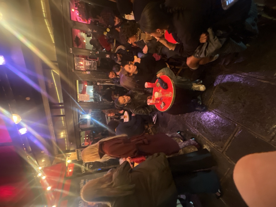 The image displays a crowded outdoor seating area of a bar or brasserie at night in Paris, France, identifiable by a visible "LE SULLY" sign. Approximately 15 to 20 individuals, primarily young adults, are present, standing and seated in groups, engaged in conversation, drinking, and smoking. The ground is a dark, wet paved surface, reflecting vibrant artificial lights that cast purple, blue, and red lens flares and reflections. A prominent red round table in the mid-ground holds multiple drinks in glasses and red plastic cups, an open pack of cigarettes, and a lighter. Several people are wearing jackets or coats. A woman in a reddish-brown coat and patterned tights stands near the left, while a person with dark braids in the right foreground holds a lit cigarette. The background reveals the illuminated interior of the establishment through large windows, with additional patrons visible inside.