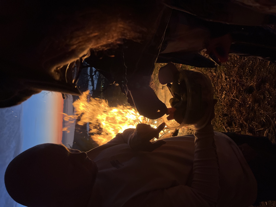 A person lies on their back, illuminated by a campfire's glow