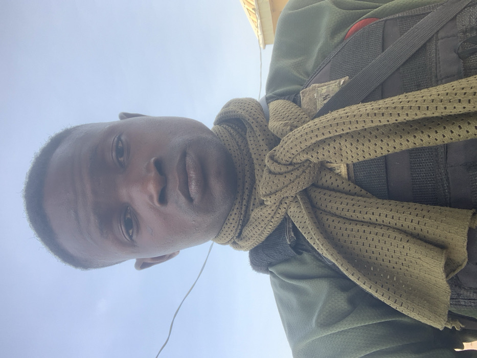A selfie of a dark-skinned man with short hair, appearing to be outdoors under a blue sky. He's wearing military-style attire including a vest with straps and an olive green, mesh scarf wrapped around his neck. The camera angle is low, pointing up at his face. His expression is neutral.