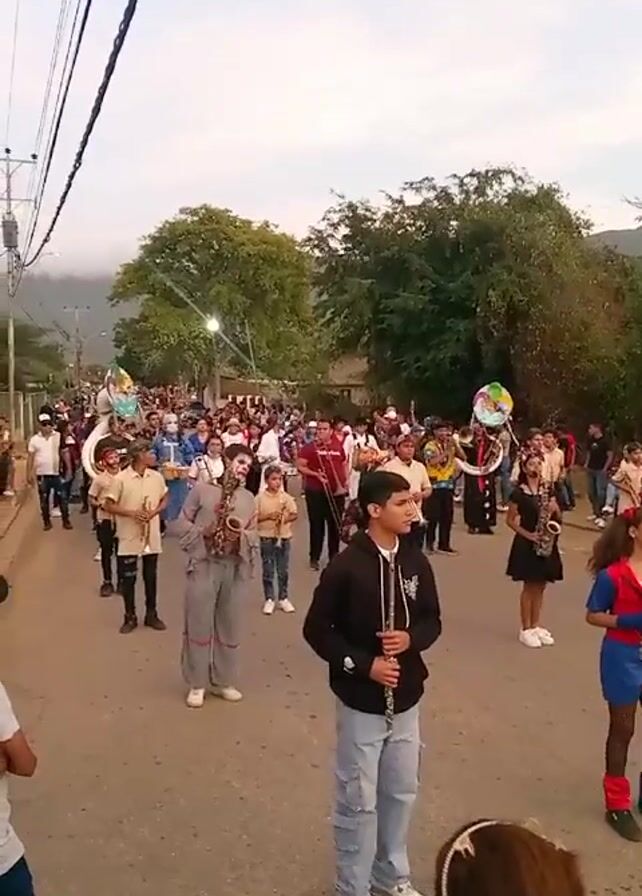 parade taking place on a street. A group of people, some dressed in clown costumes and others in ordinary clothing, are walking down the street playing musical instruments. These instruments include saxophones, clarinets, and tubas. Some people are standing by the side of the road watching the parade. There are buildings on either side of the street, and trees and mountains can be seen in the background. The weather appears to be cloudy.